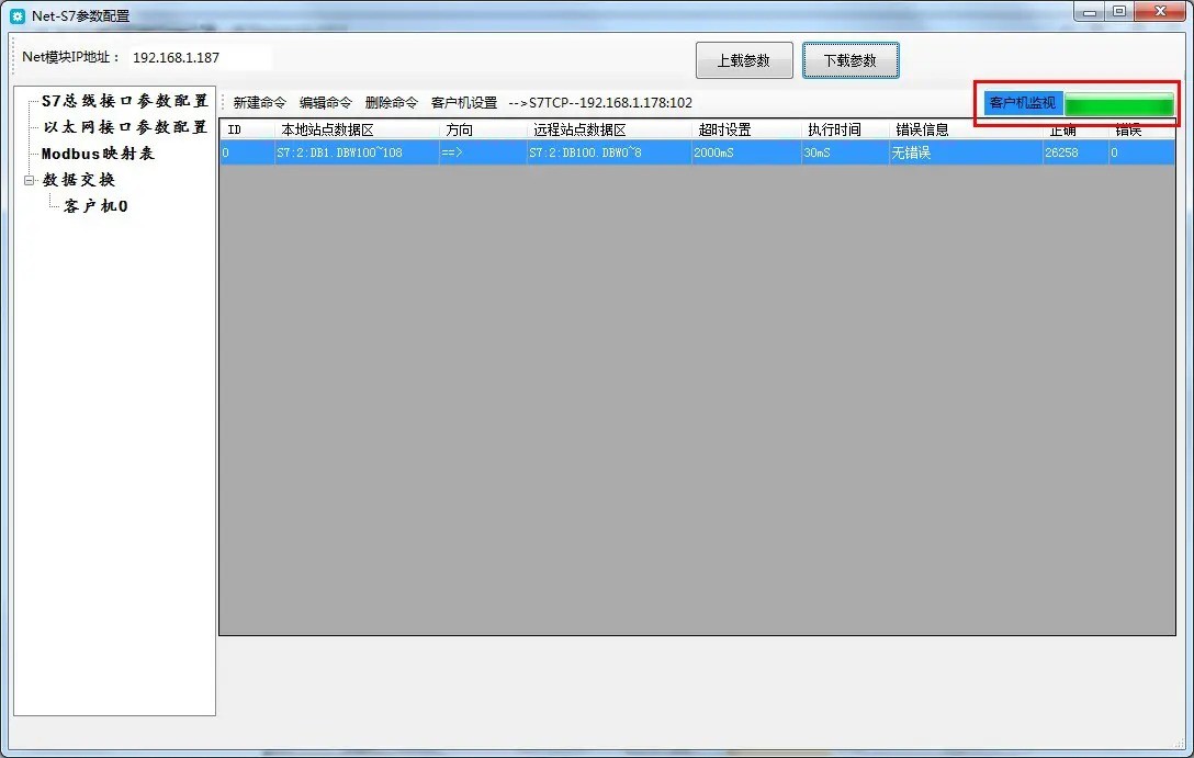 点击客户机监视按钮,【错误信息】为无错误,且【正确】有数据跳动, 说明通信成功。