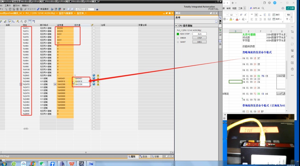 16、回到博图在监控表里输入I Q地址开始监控,在QW写入读毛重命令格式可以看到IW地址里读到了毛重的数据: